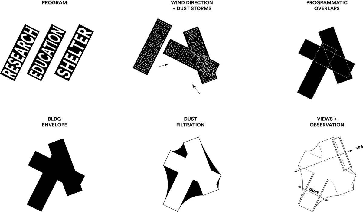 Climate Architectures addresses the urgent intersection of public health, climate change, and economic decline in one of California’s most vulnerable regions. In collaboration with climate scientists at Scripps Institution of Oceanography and UC San Diego, this project imagines a research and educational center adjacent to an existing field site. The proposed research and educational facility at the Salton Sea is conceived as an architectural instrument that makes climate change visible. Its defining feature is a permeable membrane that filters airborne dust from the shrinking lakebed, creating a stratigraphy on the building’s surface that records environmental change over time, much like layers of rock. This dynamic façade transforms the structure into both a protective enclosure and a didactic tool, embodying the region’s evolving climate conditions. Organized to accommodate scientific research, educational programming, and community engagement, the building is designed as a hybrid space where architecture operates simultaneously as shelter, laboratory, and climate register.