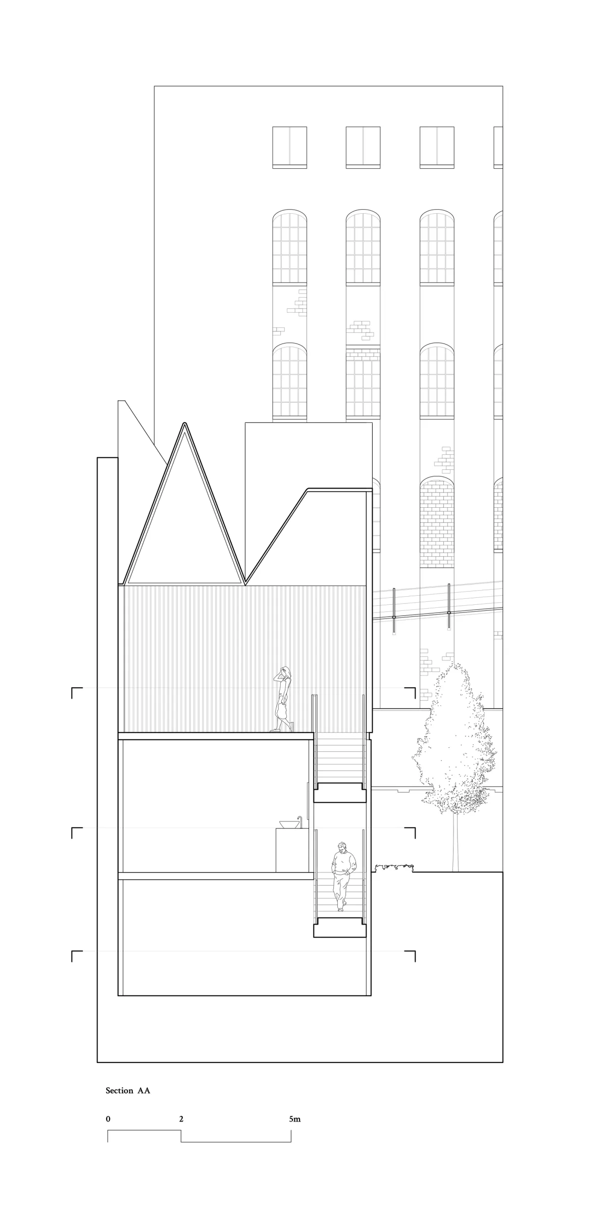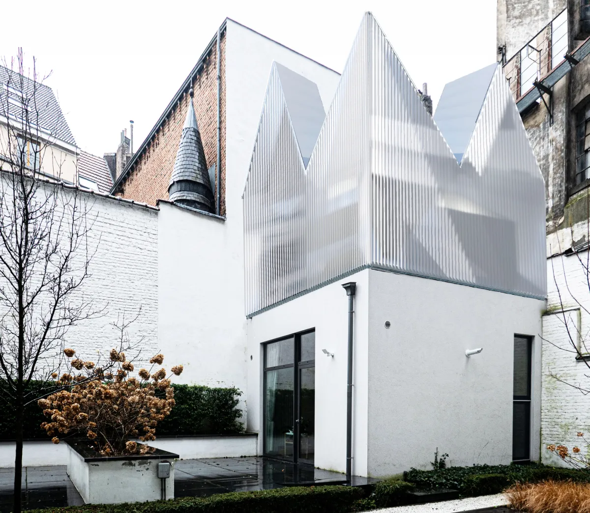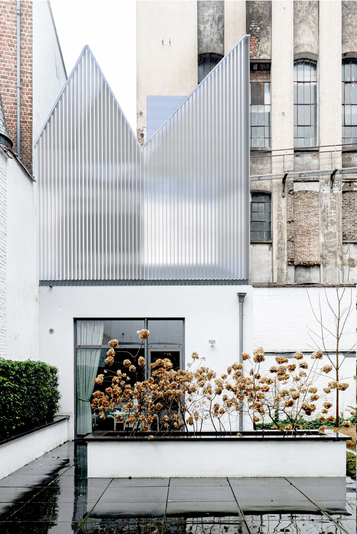 Porte de Namur is a proposed new-build extension tucked within a residential courtyard in central Brussels, set against the backdrop of a historic chocolate factory. The 45 m² addition rises as a modulated volume with pitched gables and a skylit roof, creating a luminous second floor for a wellness spa. Clad in translucent ribbed glass, the space is filled with soft natural light for restorative treatments, somatic bodywork, and meditation. By night, the glowing façade gently illuminates the courtyard, while its reinterpreted Belgian rooflines establish a dialogue between historic context and contemporary form.
