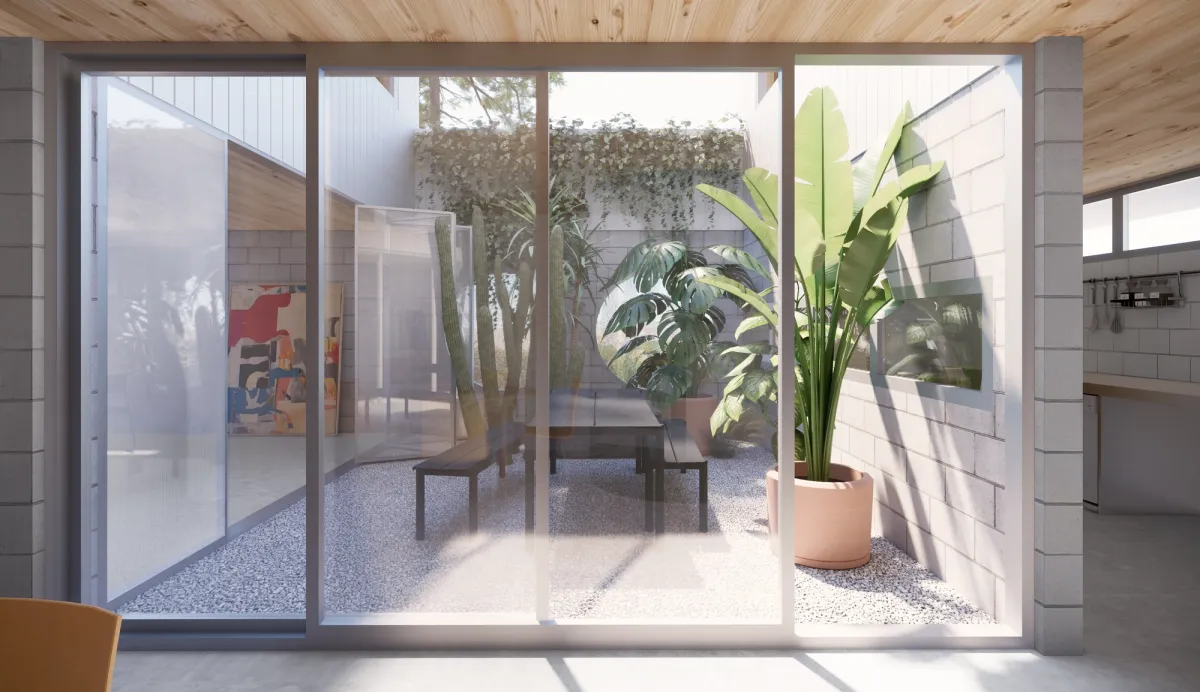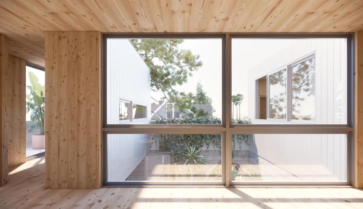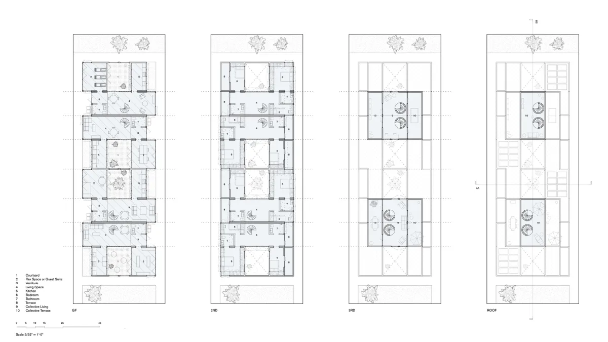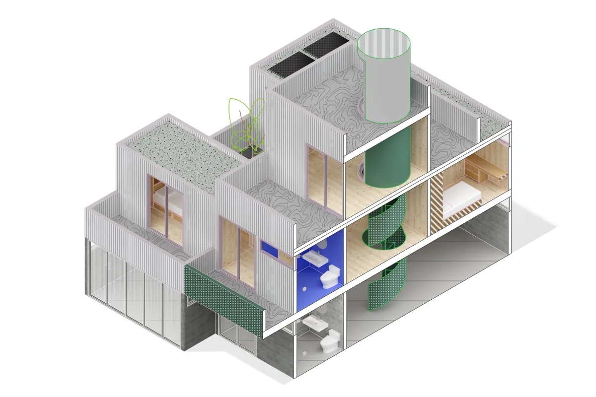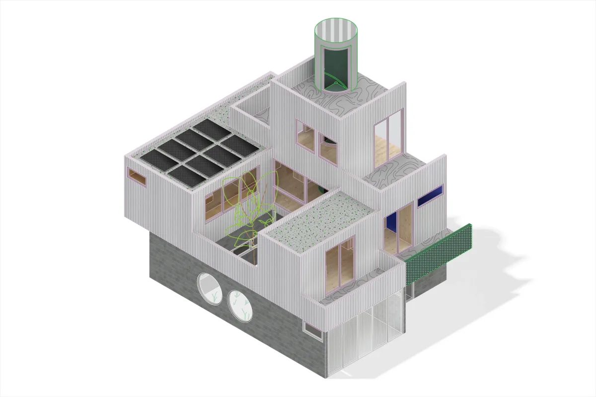 A Part, Together: Mutual Living for Los Angeles reimagines the single-family house as a framework for collective life. Organized around a generous courtyard, the design combines site-built concrete block walls with prefabricated mass-timber boxes to create flexible, reconfigurable spaces that shift between living, working, and hosting. Shared rooms, adaptable suites, and abundant terraces encourage communal use, while built-in storage and private retreats provide balance. From the open ground floor to the upper-level common room and roof terrace, the project offers a model for housing that is both adaptable and deeply social, reflecting the evolving needs of life and densification in Los Angeles.